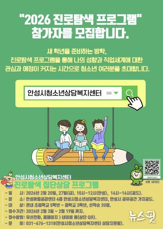 (뉴스핏 = 김수진 기자) 안성시청소년상담복지센터는 오는 20일과 27일, 2일간 청소년을 대상으로 ‘겨울방학 프로그램 – 진로탐색’을 운영한다고 11일 밝혔다.