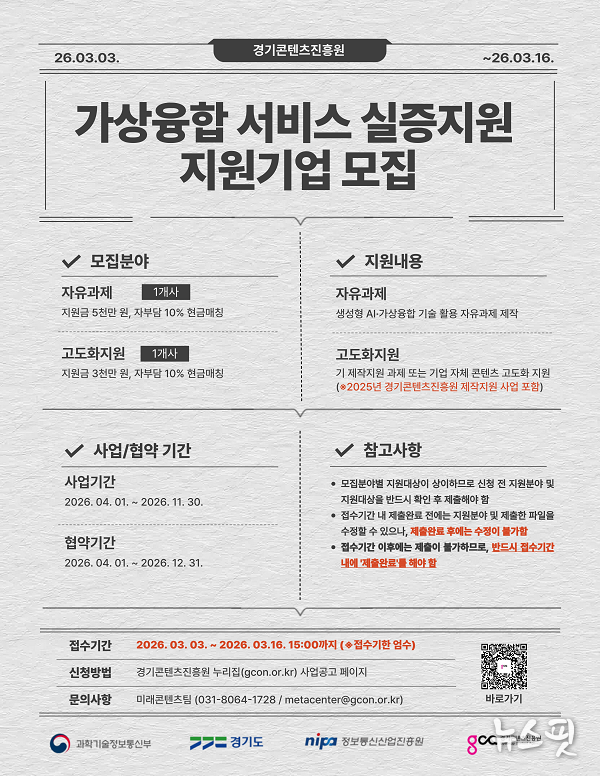 (뉴스핏 = 김수진 기자) 경기콘텐츠진흥원(이하 경콘진)은 도내 가상 융합산업 활성화를 위해 기획된 ‘가상 융합 서비스 실증 지원’ 사업의 참여 기업을 오는 3월 16일까지 모집한다고 26일 밝혔다. 이번 모집은 ▲자유과제(1개사, 5000만 원) ▲고도화 지원(1개사, 3000만 원) 등 2개 분야에서 진행된다.