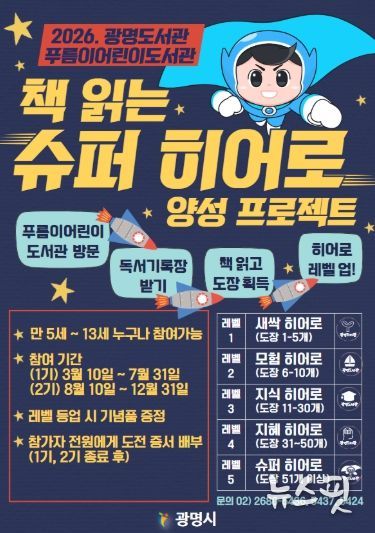 (뉴스핏 = 김수진 기자) 광명시 광명도서관은 10일부터 푸름이어린이도서관에서 어린이 독서 장려를 위한 ‘책 읽는 슈퍼 히어로(Hero)’ 양성 프로젝트를 운영한다.