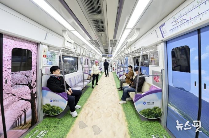 오는 9월까지 약 6개월간 운행되는 풍경열차는 하남선 전동차 1개 객차를 대상으로 운영된다. 객차 내부는 미사한강모랫길의 부드러운 질감과 하남벚꽃길의 화사함, 그리고 평화로운 한강의 풍경이 빈틈없이 랩핑되어 승객들에게 마치 하남의 명소 한복판으로 걸어 들어온 듯한 시각적 압도감을 선사한다.