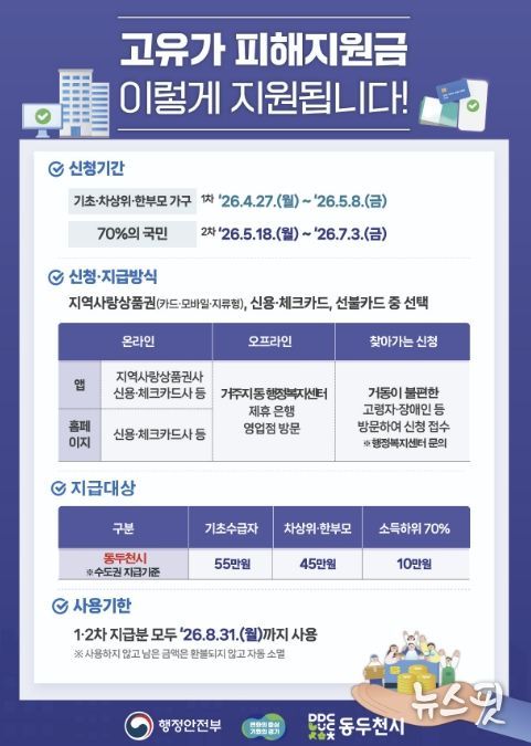 (뉴스핏 = 김수진 기자) 동두천시가 중동발 고유가와 고물가로 인한 시민 부담을 완화하고 지역경제 회복을 지원하기 위해 ‘고유가 피해지원금’을 지급한다.