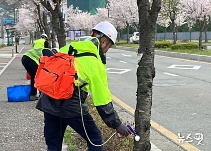 (뉴스핏 = 김수진 기자) 화성특례시 만세구는 최근 증가하는 식엽성 해충 피해에 대응하기 위해 주요 벚나무길을 중심으로 수간주사 방제를 실시했다고 27일 밝혔다.
