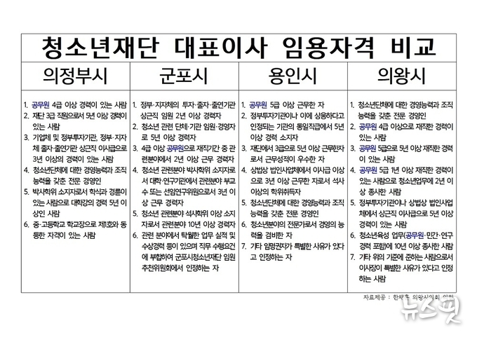 (뉴스핏 = 박선화 기자) 경기 의왕시청소년재단 대표이사 임용자격 기준이 지나치게 공무원 경력에 편중되어 있다는 지적이 제기됐다.