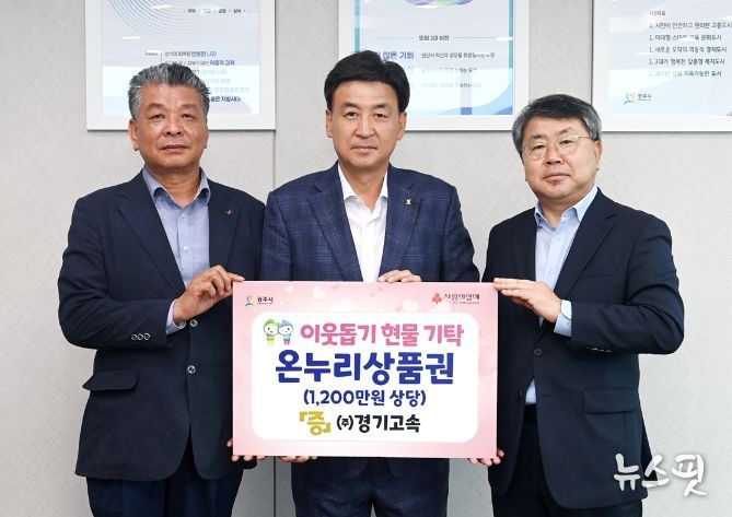 (뉴스핏 = 김호 기자) ㈜경기고속은 지난 4일 광주시청을 방문, 어려운 이웃을 위해 사용해 달라며 온누리상품권 1만원권 1천200장(1천200만원 상당)을 기탁했다.