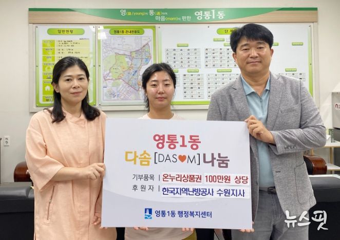 (뉴스핏 = 김호 기자) 한국지역난방공사 수원사업소는 추석 명절을 맞아 영통1동과 영통3동 행정복지센터에 각각 100만원 상당의 온누리상품권을 기탁했다.