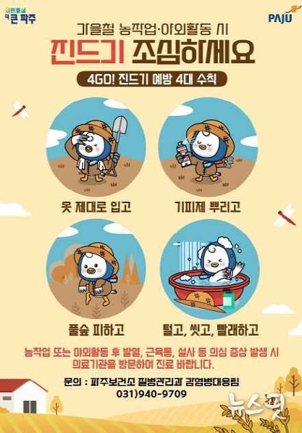 (뉴스핏 = 김호 기자) 파주시는 등산, 벌초, 농작업 등 야외활동이 많아지는 가을철을 맞아 진드기 매개 감염병에 대한 각별한 주의를 당부했다.