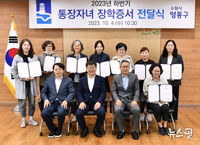 (뉴스핏 = 김호 기자) 수원시 영통구는 4일 구청 상황실에서 지역사회 발전과 주민화합에 기여하고 있는 통장 자녀 11명을 장학생으로 선발해 장학금을 전달했다.