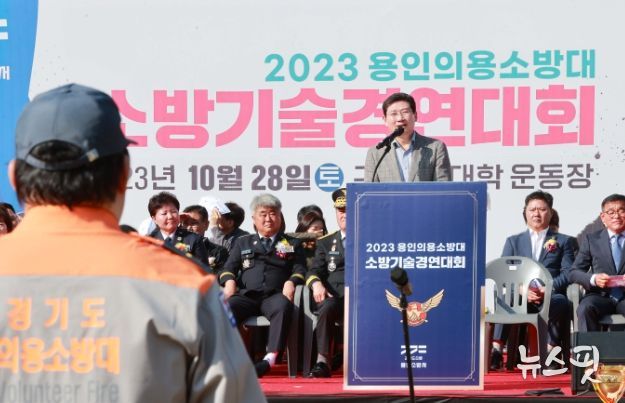 (뉴스핏 = 박선화 기자) 이상일 용인특례시장이 28일 기흥구 언남동 (구)경찰대학교 운동장에서 열린 ‘2023년 용인의용소방대 소방기술경연대회’에 참석해 소방 가족들을 응원했다.