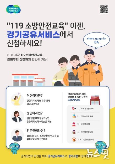 (뉴스핏 = 김호 기자) 경기도 내 회의실, 체육시설, 공유주방, 스튜디오 등 3천여 개의 공공자원을 편리하게 예약할 수 있는 경기공유서비스가 ‘119소방안전교육’ 신청 서비스를 3월 4일부터 시작한다.