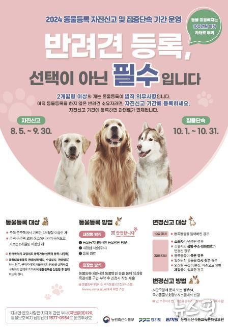 수원시는 자진신고 기간 종료 후 10월 1일부터 31일까지 ‘동물등록 집중 단속 기간’을 운영한다. 등록대상 동물을 등록하지 않은 소유자에게는 100만 원 이하 과태료가 부과된다.