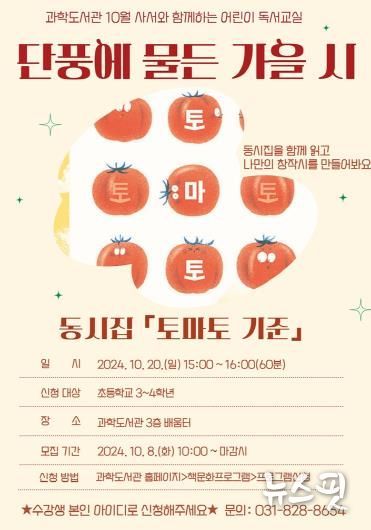이번 프로그램은 사서컬렉션 주제인 ‘동시’를 주제로 마련했다. 김준현의 동시집 '토마토 기준'을 읽으며 어린이들이 주변 사물을 색다른 관점으로 바라보고, 직접 창작시를 만들며 창의력을 키우는 시간을 갖는다.
