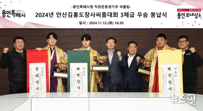 (뉴스핏 = 김수진 기자) 용인특례시는 12일 시장 접견실에서 시 직장운동경기부 씨름단이 '2024년 안산김홍도장사씨름대회'에서 개인전 3개 체급을 석권하며 최강의 전력을 과시한 선수단을 격려하는 행사를 열었다.