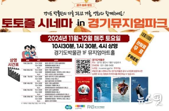 (뉴스핏 = 김호 기자) 경기문화재단 경기도박물관은 이번 가을과 겨울을 맞아 오는 11월 23일부터 12월 28일까지 매주 토요일마다 ‘토토즐 시네마 in 경기뮤지엄파크’를 진행한다. 이 프로그램에서는 다양한 영화를 매주 오전 10시 30분, 오후 1시 30분, 오후 4시에 상영하며, 각 일자별 상영작은 경기도박물관 공식 홈페이지에서 확인할 수 있다.