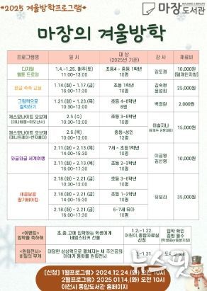 (뉴스핏 = 김수진 기자) 이천시 마장도서관은 오는 2025년 1월 겨울방학을 맞이하여, 어린이들의 즐거운 겨울방학을 위해 다채로운 프로그램을 운영한다고 밝혔다.