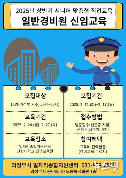 (뉴스핏 = 김호 기자) 의정부시는 관내 시니어 세대의 취업 기회를 넓히고자 ‘일반 경비원 신임교육’ 참여자 15명을 2월 11일부터 17일까지 모집한다.