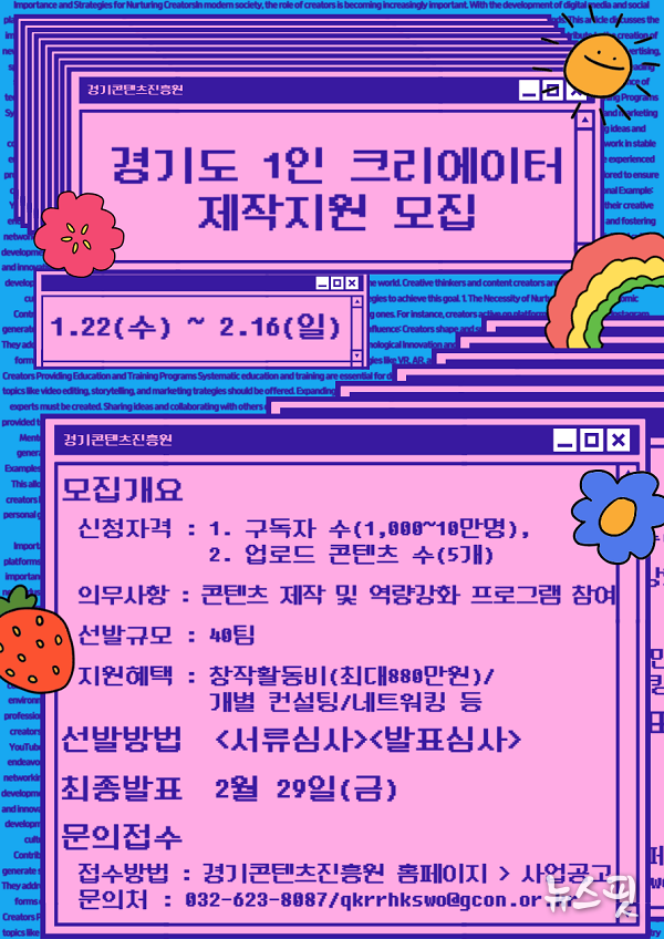 (뉴스핏 = 김수진 기자) 경기도와 경기콘텐츠진흥원이 전업 크리에이터(온라인 영상 창작자)를 육성하는 ‘2025 경기도 1인 크리에이터 제작지원’ 사업 참여자를 오는 16일까지 모집한다.