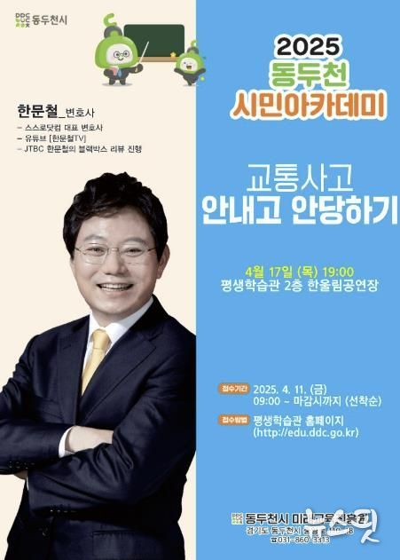 (뉴스핏 = 김호 기자) 동두천시는 평생학습관에서 4월 17일 오후 7시에 한문철 변호사를 초청해 ‘교통사고 안 내고 안 당하기’라는 주제로 2025년 동두천 시민아카데미 2강을 개최한다고 밝혔다.