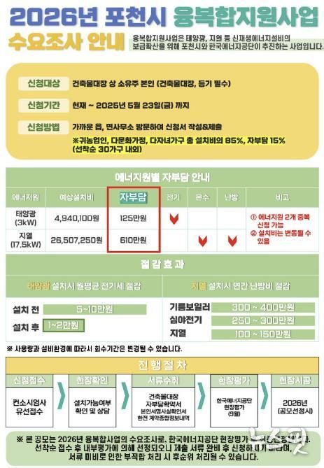(뉴스핏 = 김호 기자) 포천시는 오는 23일까지 산업통상자원부 주관 ‘2026년 신재생에너지 융복합지원사업’ 공모 신청을 위한 수요 조사를 한다.