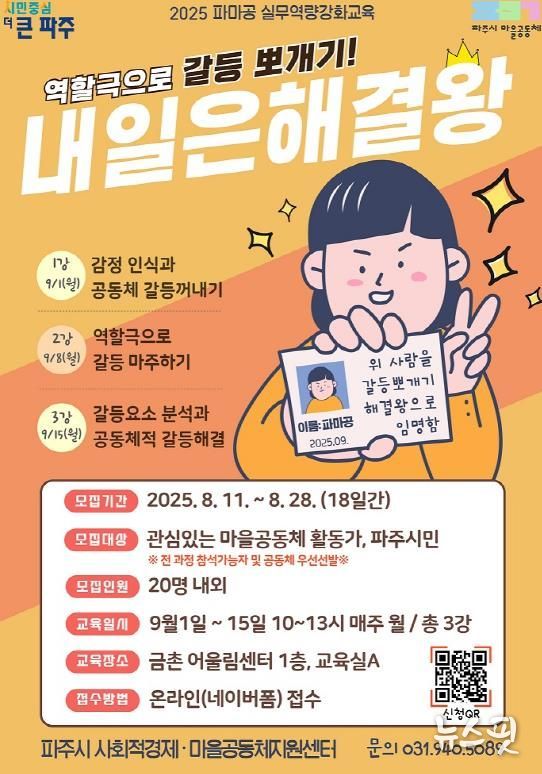 (뉴스핏 = 김호 기자) 파주시는 마을공동체 갈등 해결과 소통 역량 강화를 위한 실무 교육 프로그램 ‘내일은 해결왕’ 참가자를 오는 8월 28일까지 모집한다.
