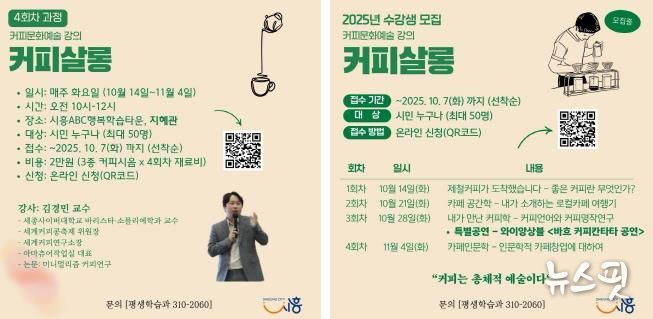 (뉴스핏 = 김수진 기자) 시흥시는 민간주도형 지역축제 지원사업인 ‘2025년 시흥시 지역특화 관광축제 지원사업’에 선정된 ‘세계 커피콩 축제’의 사전 연계 프로그램으로 커피문화예술 특강 ‘커피살롱’을 오는 14일부터 11월 4일까지 시흥ABC행복학습타운 지혜관에서 총 4회에 걸쳐 진행한다.
