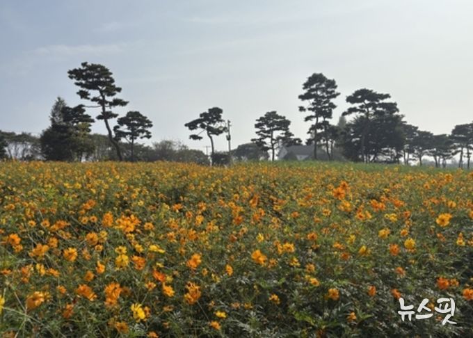 (뉴스핏 = 김호 기자) 여주시 남한강 출렁다리 남단 일원 연양동에 위치한 금은모래강변공원 초화원에 황화코스모스가 만개하여 손님맞이 준비를 마쳤다.