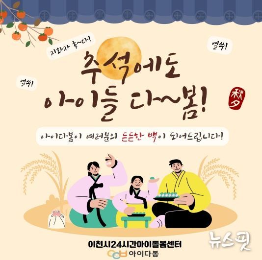 (뉴스핏 = 김호 기자) 이천시는 추석 연휴 기간에도 이천시 24시간 아이돌봄센터인 ‘아이다봄’을 365일 24시간 정상 운영해 연휴 중 발생할 수 있는 돌봄 공백을 최소화한다고 밝혔다.