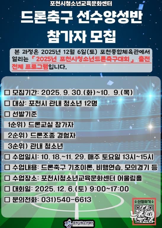 이번 프로그램은 12월 6일 포천종합체육관에서 열리는 ‘2025년 포천시 청소년드론축구대회’에 출전할 선수를 발굴·육성하기 위해 마련했다. 참가 청소년들은 드론축구 기초이론, 비행 연습, 모의 경기 등 체계적인 훈련 과정을 거쳐 최종적으로 대회에 출전하게 된다.