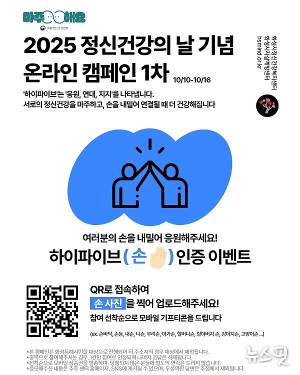 시민 누구나 참여할 수 있는 온라인 캠페인은 2회에 걸쳐 진행된다. 1차는 10일부터 오는 16일까지로, 서로에게 응원의 손을 내민다는 의미의 ‘하이파이브 손 인증 캠페인’이 운영되며, 2차는 오는 17일부터 24일까지 서로의 마음을 이해하고 지지하는 ‘마주해요 N행시 캠페인’이 운영된다.