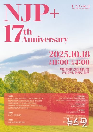 (뉴스핏 = 김수진 기자) 경기문화재단 백남준아트센터(NJP, 관장 박남희)는 2025년 10월 18일, 개관 17주년 기념 축제 'NJP+'를 연다. 특히 이번 행사는 백남준아트센터와 경기도박물관, 경기도어린이박물관으로 이어지는 산책로 환경개선과 맞물려 축하의 의미를 더하고 있다. 아트센터는 올해 시민 예술 교육프로그램인 ‘퍼블릭 아카데미’ 운영, 지역 연계 협력 축제인 ‘제8회 머내마을영화제’ 공동체 상영관 참여, 유휴부지에 공유 정원을 조성하는 ‘이키로(2km) 정원행동 캠페인’ 등 지역과 환경을 잇는 새로운 고객서비스 프로그램을 기획·추진하고 있다.