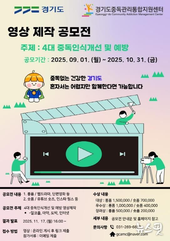 참여 희망자는 온라인에 영상을 게시한 뒤 링크를 제출하고 참가신청서를 오는 31일까지 전자우편으로 접수하면 된다. 수상작은 전문가 심사를 거쳐 선정되며, 오는 11월 중 경기도 중독관리통합지원센터 누리집을 통해 발표할 예정이다.