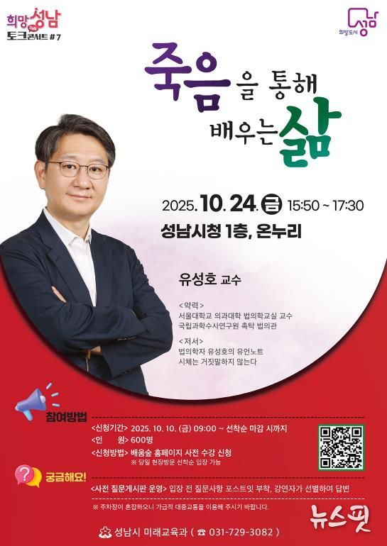 (뉴스핏 = 김호 기자) 성남시는 법의학자인 유성호 서울대 교수를 초빙해 오는 10월 24일 오후 3시 50분 시청 1층 온누리에서 ‘희망성남 토크콘서트 7강’을 연다.