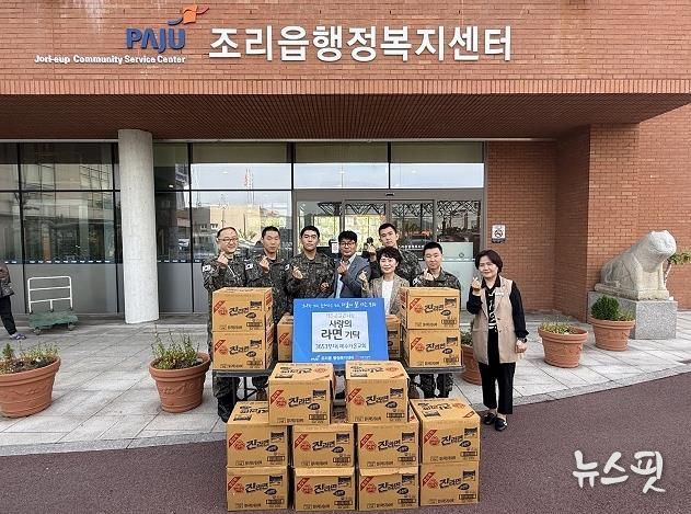 (뉴스핏 = 김호 기자) 파주시 조리읍은 지난 2일, 3653부대 장병들과 예수가온교회가 추석을 맞아 지역 내 어려운 이웃을 돕기 위해 라면 16박스를 기탁했다고 밝혔다.