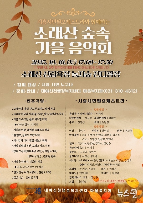 (뉴스핏 = 김수진 기자) 시흥시 대야·신천행정복지센터는 오는 18일 소래산 삼림욕장 놀자숲 잔디광장에서 대야·신천동 지역 주민을 위한 ‘소래산 숲속 가을 음악회’를 개최한다.