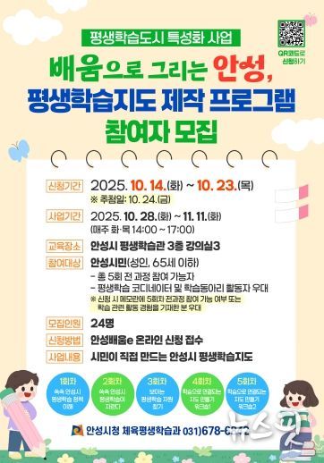 (뉴스핏 = 김수진 기자) 안성시는 시민 주도형 평생학습 프로그램인 '배움으로 그리는 안성 – 평생학습지도 제작 프로그램'을 오는 28일부터 11월 11일까지 매주 화·목 14시부터 17시까지 안성시평생학습관에서 운영한다고 15일 밝혔다