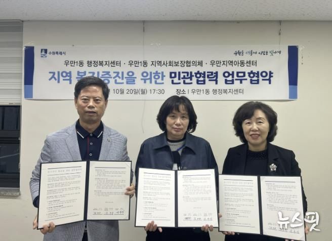 (뉴스핏 = 김호 기자) 수원시 팔달구 우만1동 지역사회보장협의체, 행정복지센터는 지난 20일, 우만지역아동센터와 위기 아동의 조기 발견 및 지원 강화를 위한 업무협약을 체결했다.