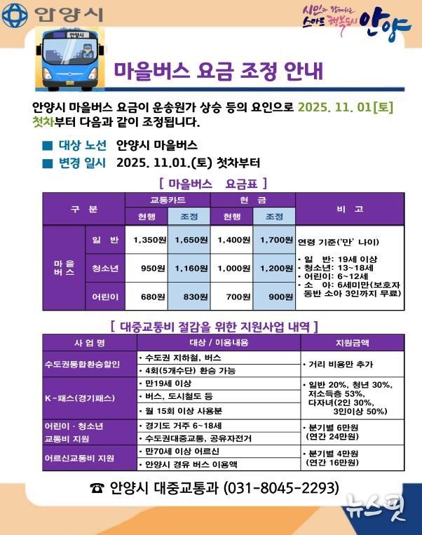 이번 인상에 따른 교통카드 기준 마을버스의 요금은 ▲일반 1,350원→1,650원(300원 인상) ▲청소년 950원→1,160원(210원 인상) ▲어린이 680원→830원(150원 인상)이다. 11월 1일부터 안양시 관할 마을버스 노선에 일괄 적용된다.