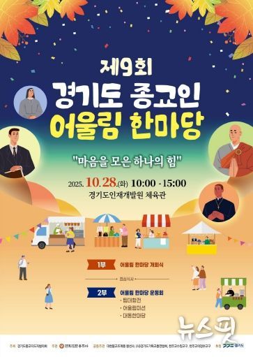 (뉴스핏 = 김수진 기자) 경기도는 28일 경기도인재개발원 체육관에서 ‘제9회 경기도 종교인 어울림 한마당’을 개최했다. 이번 행사는 불교, 천주교, 개신교 등 3대 종교가 함께 참여해 이웃 종교에 대한 이해를 높이고, 종교적 차이를 넘어서는 소통과 화합을 도모하기 위해 마련됐다.