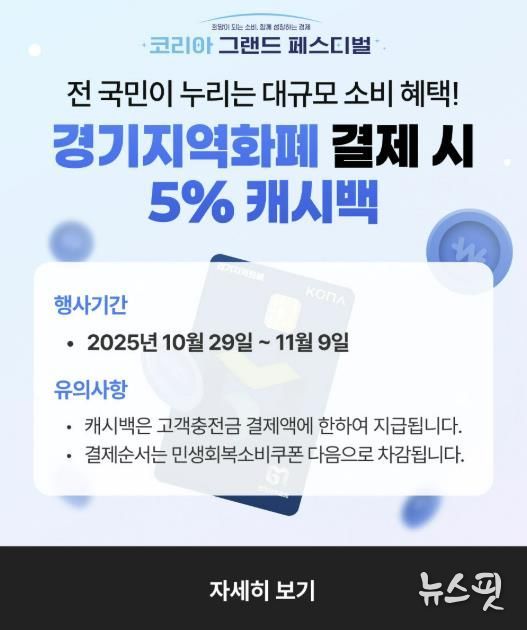 (뉴스핏 = 김호 기자) 동두천시는 29일부터 11월 9일까지 '코리아 그랜드 페스티벌' 기간 동안 지역화폐 ‘동두천사랑카드’ 결제금액의 5%를 캐시백으로 지급하는 이벤트를 진행한다고 밝혔다.