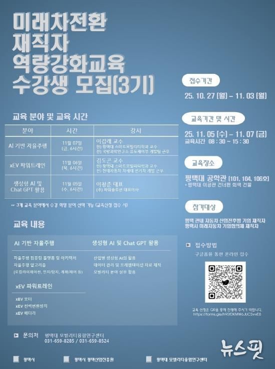 교육 운영기관인 평택대학교는 강사진 구성과 실습환경 및 교육 품질 관리 등 전체 과정을 직접 담당하며, 1ܨ기 교육을 통해 축적된 피드백을 반영해 3기 과정에서는 AI·전기전장 융합 분야 및 생성형 AI 실습을 강화했다.