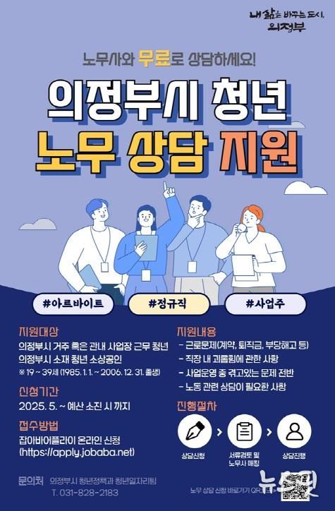 (뉴스핏 = 김호 기자) 의정부시는 청년들의 근로권익 보호와 건강한 노동환경 조성을 위해 ‘찾아가는 청년 노무사 상담'을 운영한다.