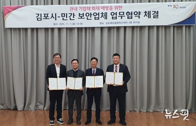 (뉴스핏 = 김호 기자) 김포시가 지난 11월 7일 민간 보안업체 3개사와 ‘관내 기업체 화재 예방을 위한 민관 협력 업무협약(MOU)’을 체결했다. 이번 협약식은 최근 소규모 공장과 상가에서 발생한 화재가 초기 대응 지연으로 인해 큰 피해로 이어지는 사례가 늘어남에 따라 민간의 기술력과 공공의 행정력을 결합해 화재로부터 안전한 산업환경을 조성하기 위해 마련됐다.