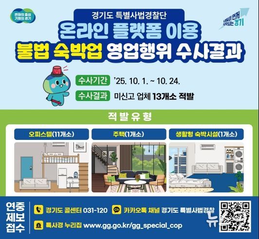 경기도 특별사법경찰단은 10월 1일부터 24일까지 고양, 부천, 성남, 화성, 안양, 김포, 용인, 파주 등 8개 지역에서 불법영업으로 의심되는 숙박업소에 대한 단속을 벌여 미신고 영업 13곳 25개 객실을 적발했다고 11일 밝혔다.