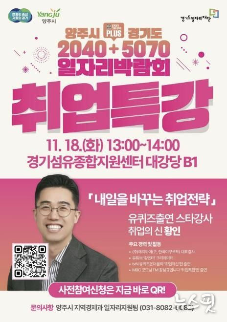 (뉴스핏 = 김호 기자) 양주시가 오는 18일 경기섬유종합지원센터에서 열리는 '2025 양주시·경기도 2040+5070 통합 일자리박람회'에서 취업 전문가 황인 강사의 특별 강연을 진행한다.