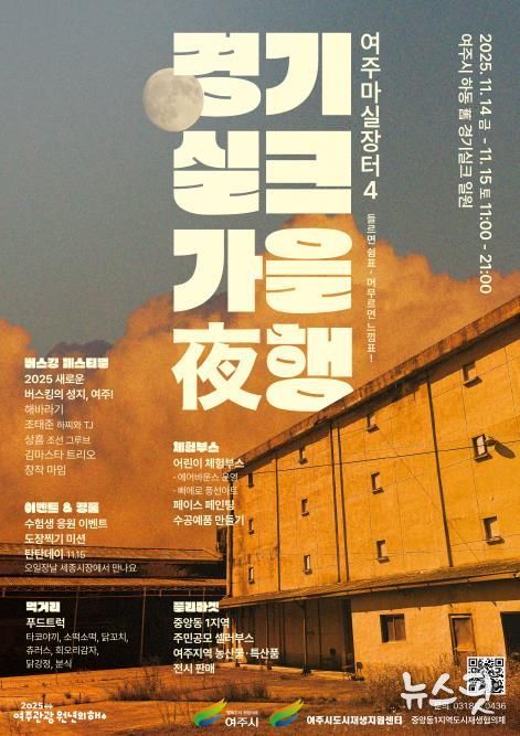 (뉴스핏 = 김수진 기자) 여주시는 오는 11월 14일부터 15일까지 이틀간 여주 경기실크 일원(여주시 하동 123-6번지)에서 '여주마실장터4 가을야행'을 개최한다고 밝혔다. 이번 행사는 '2025 새로운 버스킹의 성지, 여주!'라는 슬로건 아래, 깊어가는 가을밤의 정취를 더할 버스킹 페스티벌과 함께 다채로운 마켓과 체험을 선보일 예정이다.