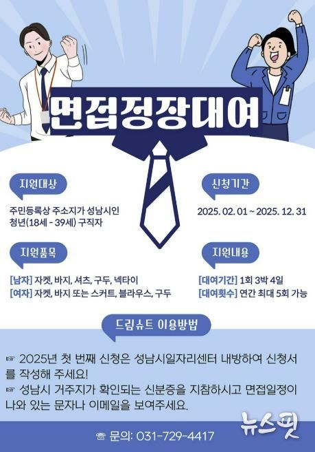 (뉴스핏 = 김호 기자) 성남시는 사회에 첫발을 내딛는 청년 구직자의 취업 준비를 지원하고 경제적 부담을 덜어주기 위해 ‘청년 면접정장 무료 대여사업’을 확대 실시한다.