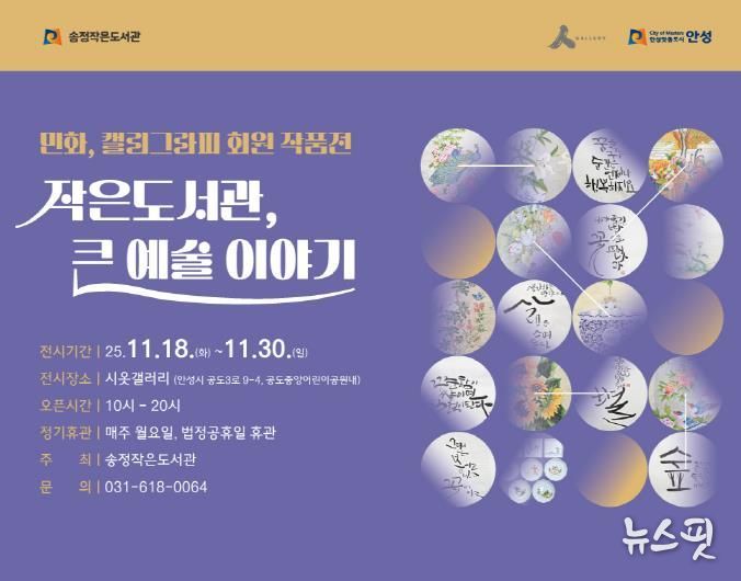 (뉴스핏 = 김수진 기자) 안성천 공도 작은미술관 시옷갤러리에서는 오는 18일부터 30일까 지 송정작은도서관의 지역 주민으로 구성된 민화 캘리그라피 회원들의 작품을 모은 전시회 ‘작은도서관, 큰 예술 이야기’가 열린다.
