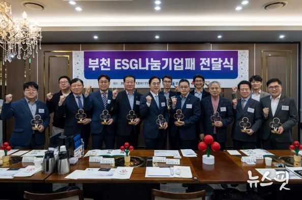 (뉴스핏 = 김호 기자) 부천시는 지난 12일 경기사회복지공동모금회와 함께 ‘부천ESG 나눔기업패’ 전달식과 오찬 간담회를 열었다. 이날 행사에는 남동경 부시장, 김효진 경기사회복지공동모금회 사무처장, 부천ESG 나눔기업 11곳의 대표 등이 참석했다.