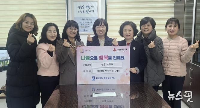 민상희 매탄4동장은 “어린이집 원장님들께서 보여주시는 꾸준한 이웃사랑이 우리 아이들에게 좋은 본보기가 되고 있다”며 “전달된 성금은 따뜻한 마음이 온전히 전해질 수 있도록 꼭 필요한 곳에 소중하게 사용하겠다”고 감사의 마음을 전했다.