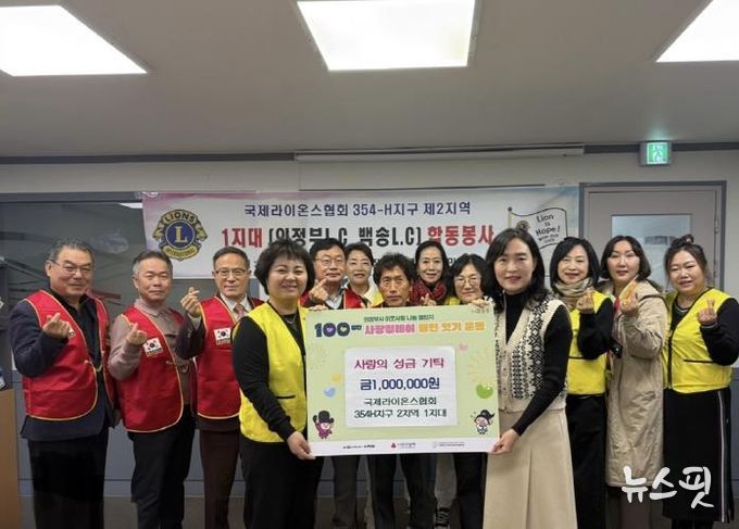 (뉴스핏 = 김호 기자) 의정부시 신곡2동주민센터는 11월 18일 국제라이온스협회 354-H 2지역 1지대가 성금 100만 원을 기탁하며 ‘100일간 사랑릴레이 배턴 잇기’에 동참했다고 밝혔다.