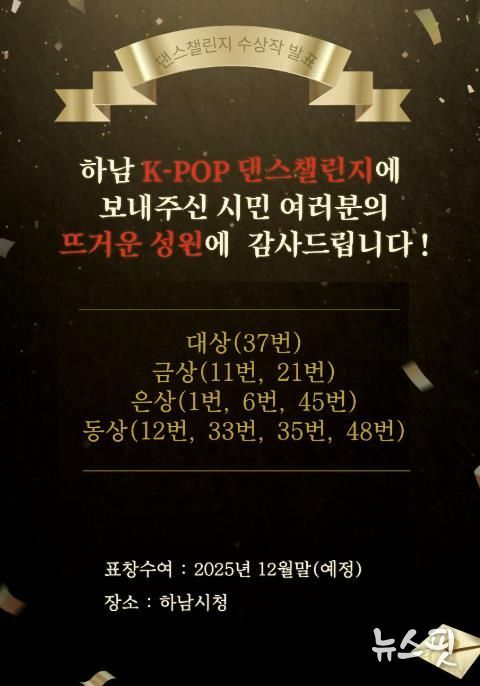 한편, 시는 오는 12월 종무식에서 대상·금상·은상·동상 등 수상자에게 시장 표창을 수여할 예정이며, 입상팀들의 댄스 영상은 하남시 공식 유튜브 채널을 통해 계속 만나볼 수 있다.